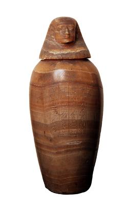 Vaso canopo di Cia-en-heb, in alabastro egiziano, dall'Egitto; Il coperchio raffigura Amseti, una delle quattro divinità denominate Figli di Horo