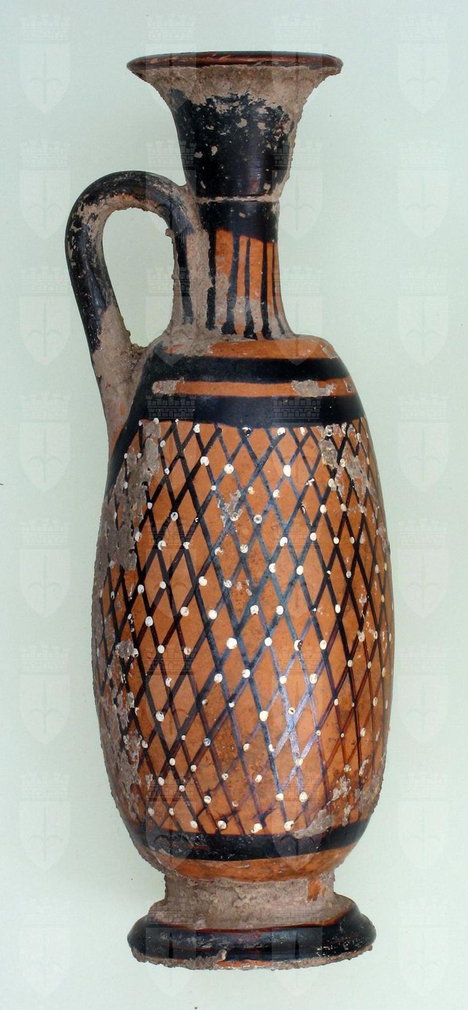 Epichysis apulo in terracotta a figure rosse da Rudiae. Lato A: testa femminile con stephanè