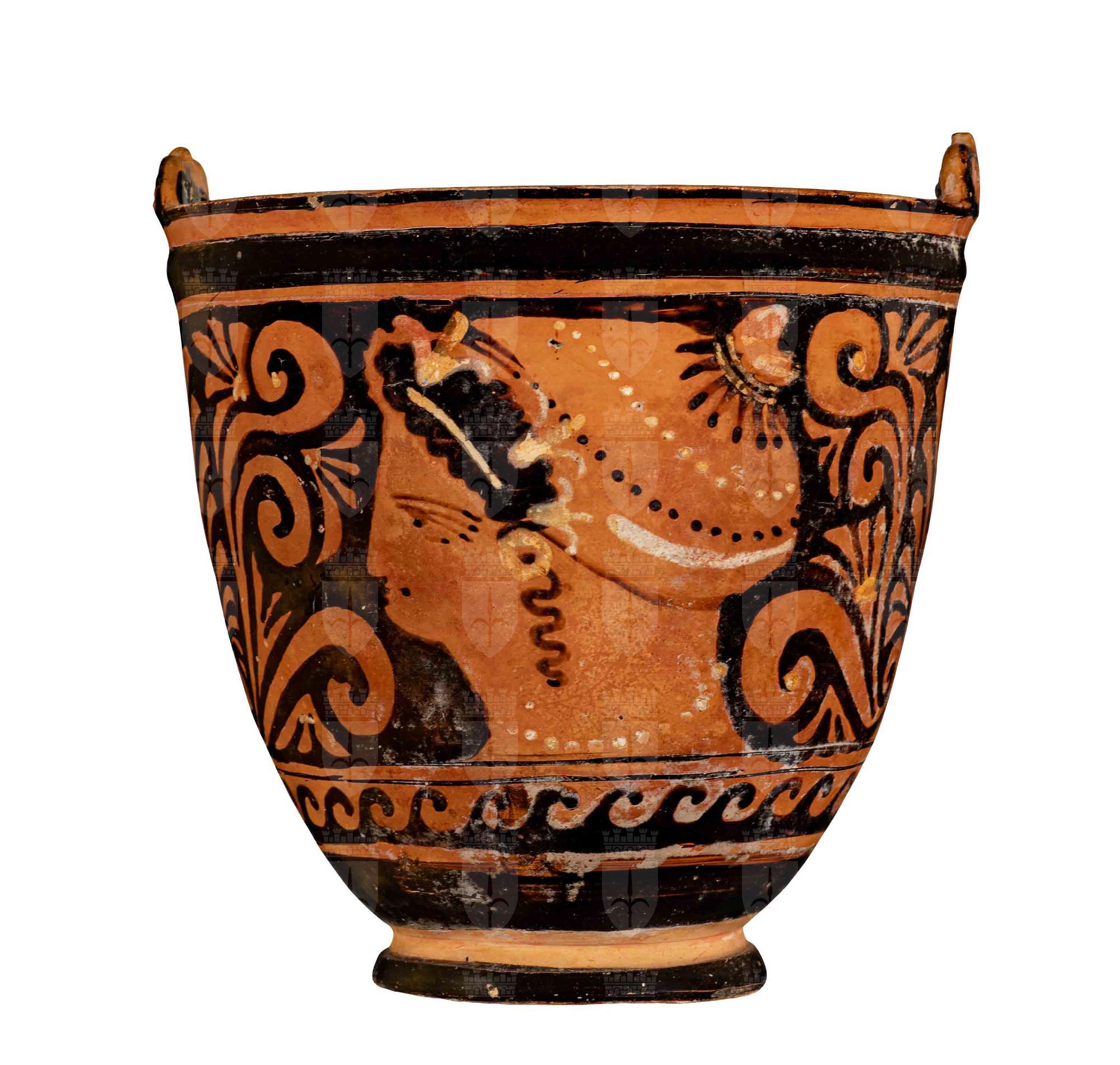 Cratere a calice con testa femminile a vernice nera sovraddipinta