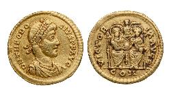 Solido con testa di Teodosio I / Due imperatori in trono con vittoria