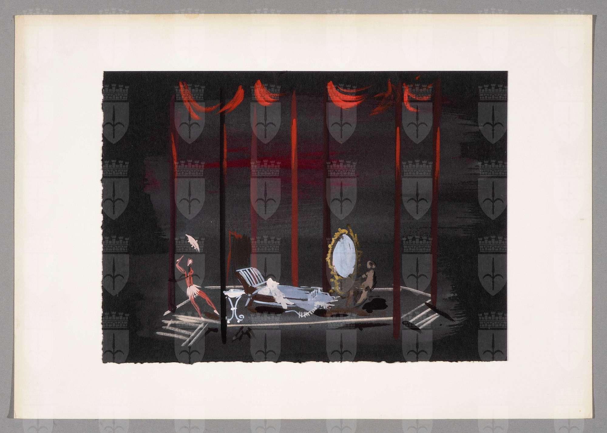 La morte di Danton, dramma di George Büchner. Interno camera con specchiera ovale e figura umana con ombrellino