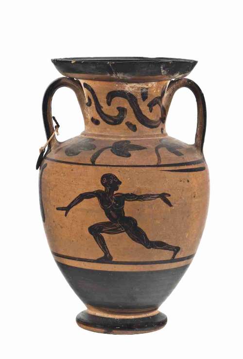 Anfora campana a figure nere. Lato A:efebo nudo in marcia; Lato B: satiro nudo in marcia