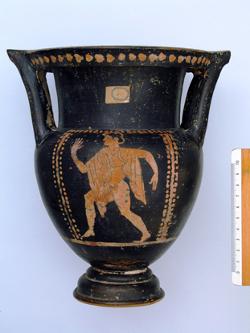 Cratere a campana con maschera a vernice nera sovraddipinta