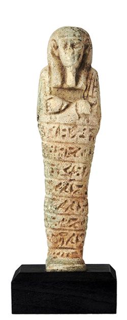 Frammento di usciabti in faience, appartenuto al padre divino Pa-nefer-..., del Terzo Periodo Intermedio, inv. 39258; Statuetta funeraria mummiforme, dall'Egitto