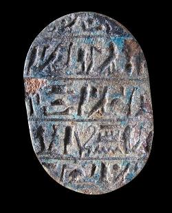 Scarabeo in steatite con testo incomprensibile, dall'Egitto