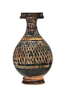 Bombylios o unguentario a bottiglia a vernice nera sovraddipinta a reticolo