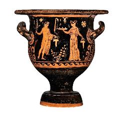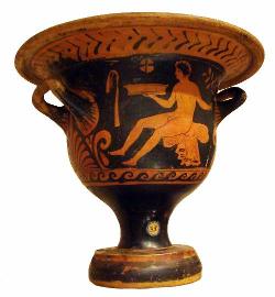 Cratere a campana apulo a figure rosse. Lato A: gioco del kottabos; Lato B: tre giovani ammantati