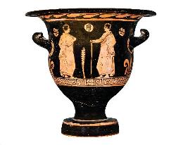 Cratere a campana apulo a figure rosse. Lato A: scena di offerta; Lato B: due giovani ammantati.