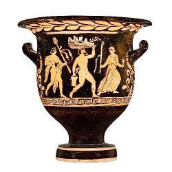 Cratere a campana apulo a figure rosse. Lato A: Dioniso, menade e satiro; Lato B: tre giovani ammantati