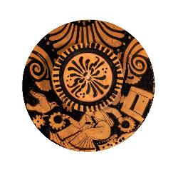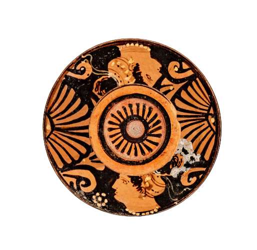 Piccolo coperchio apulo a figure rosse con due teste femminili tra palmette