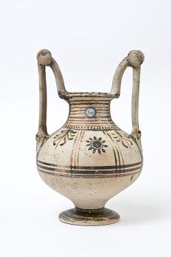 Trozzella in ceramica messapica con motivo vegetale e anfora