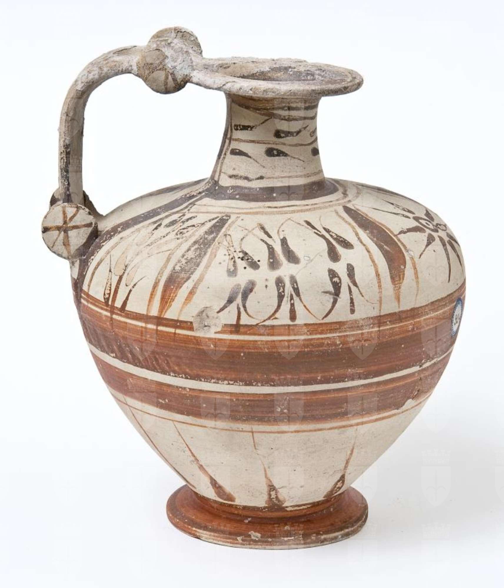 Brocca con ansa a rotella in ceramica messapica con motivi vegetali