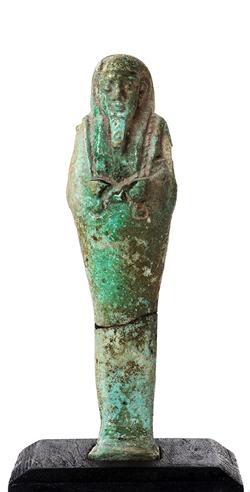 Usciabti amuleto con foro passante, in faience, di Epoca Tarda, inv. 39265; Statuetta funeraria mummiforme, dall'Egitto