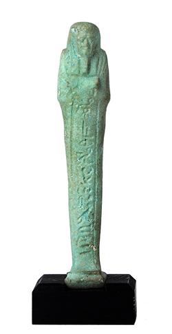 Frammento di usciabti in faience, appartenuto al padre divino Pa-nefer-..., del Terzo Periodo Intermedio, inv. 39258; Statuetta funeraria mummiforme, dall'Egitto