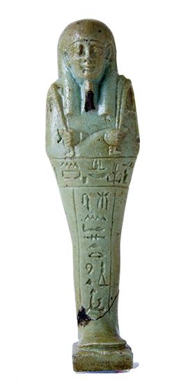 Usciabti in faience del sacerdote lettore del tempio e profeta Her-ef-er-neith, della XXVII-XXX dinastia, inv. 31445; Statuetta funeraria mummiforme, dall'Egitto