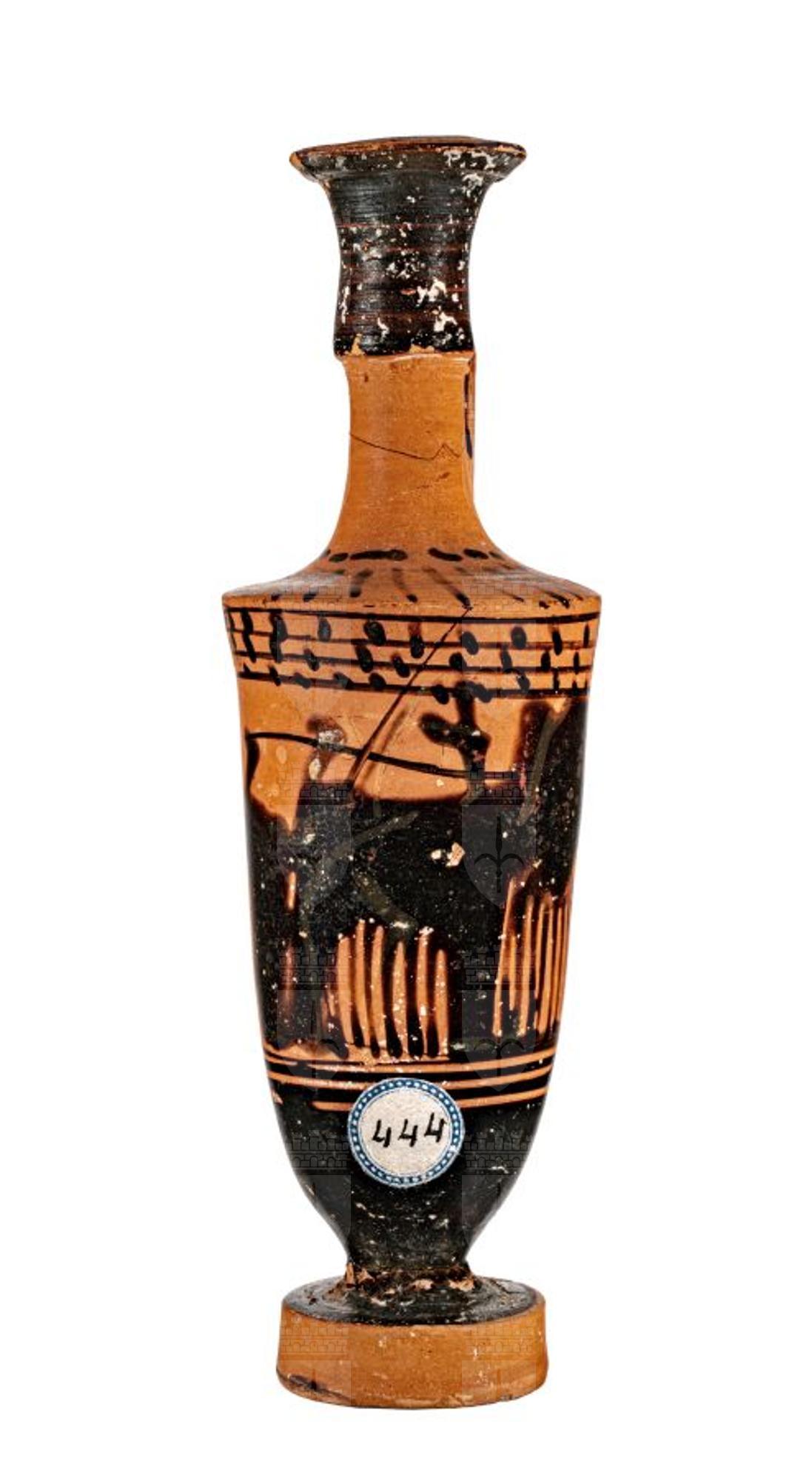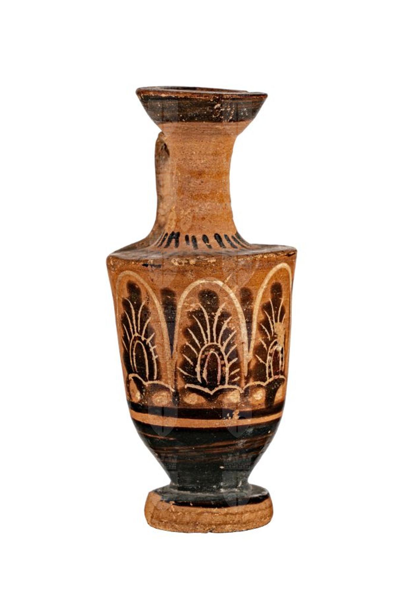 Lekythos attica a figure nere con motivo a bastoncelli e fiori di loto