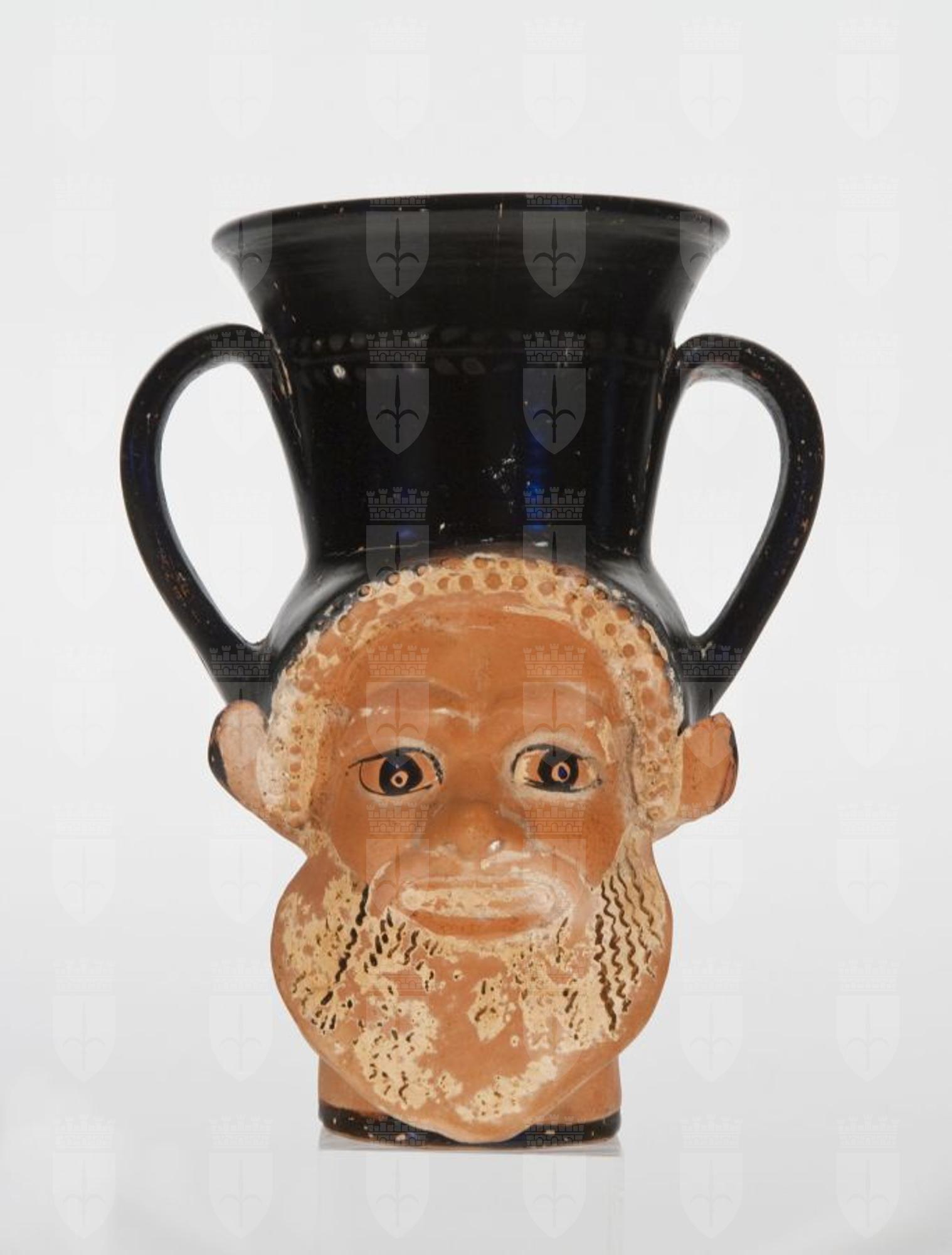 Kantharos configurato attico a figure rosse. Lato A: testa di satiro. Lato B: testa di menade