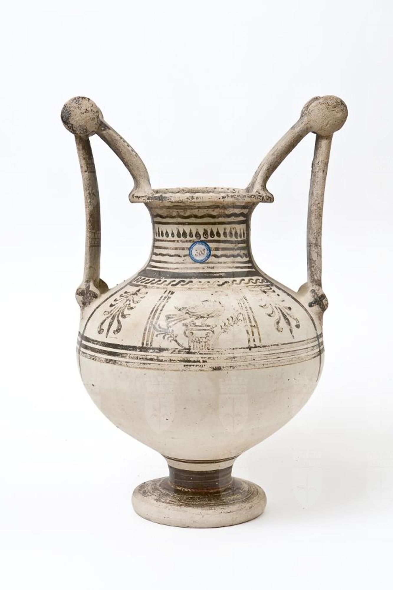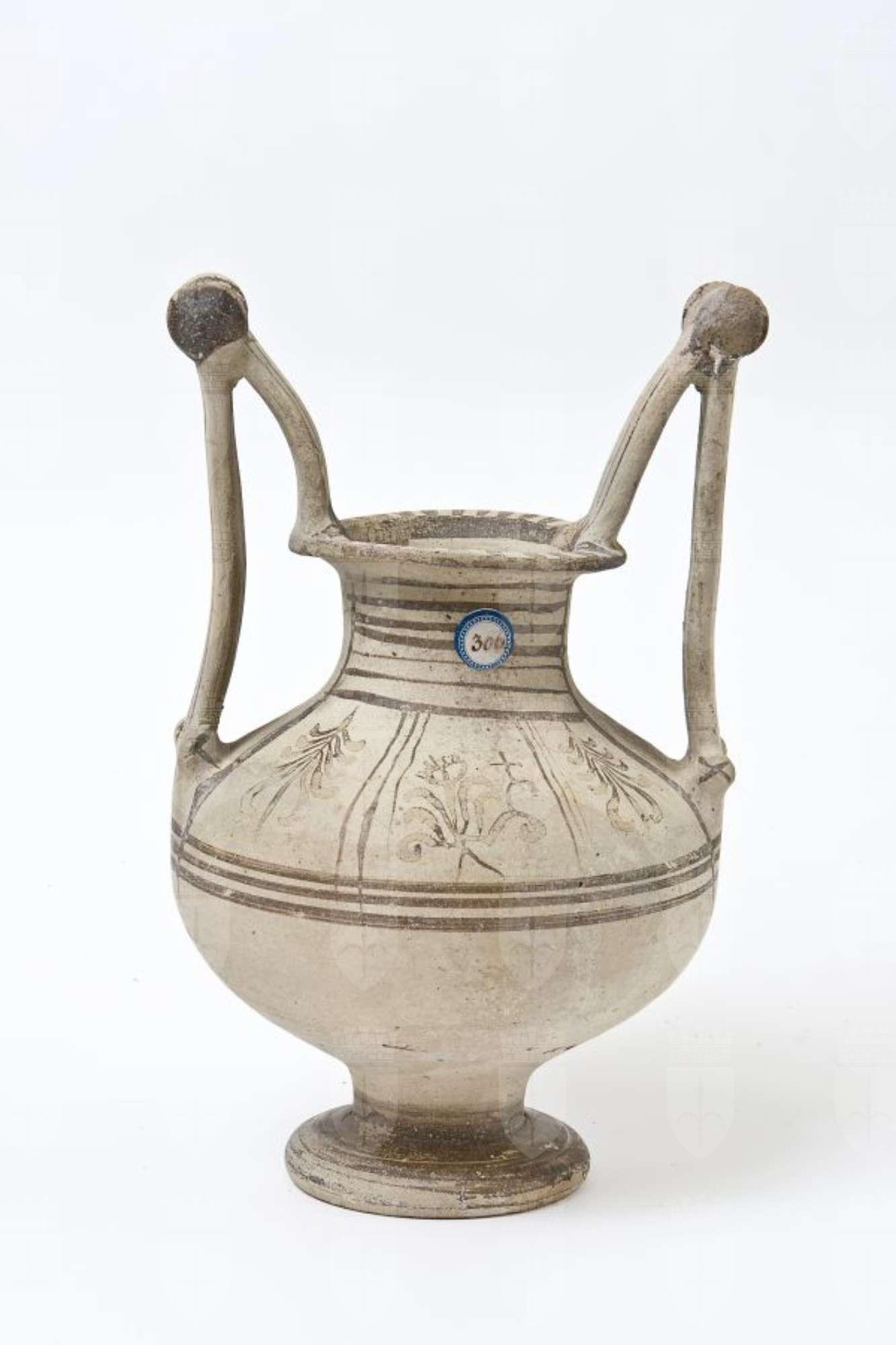 Trozzella in ceramica messapica con motivo vegetale e anfora
