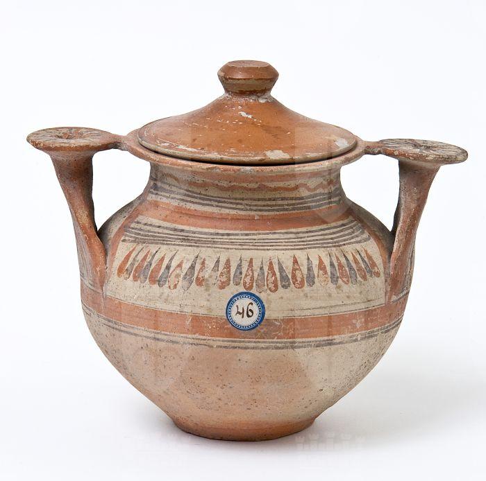 Olla con anse a scalpello e rotella in ceramica messapica con coperchio
