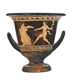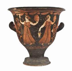 Cratere a campana campano a figure rosse Lato A:scena dionisica con menadi; Lato B: due giovani ammantati