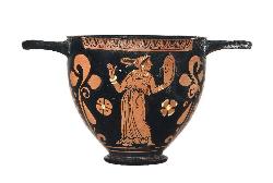 Skyphos apulo a figure rosse. Lato A: donna stante. Lato B: giovane nudo