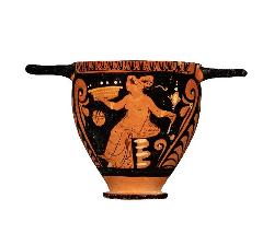 Skyphos campano a figure rosse su ambo i lati: giovane ammantato