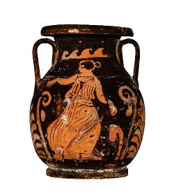 Pelike attica a figure rosse. Lato A: due donne e una cassa. Lato B: donna