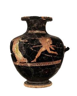 Hydria miniaturistica attica a figure rosse con donna inseguita da uomo