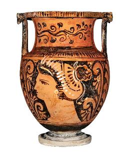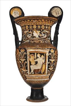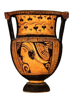 Cratere a campana con maschera a vernice nera sovraddipinta