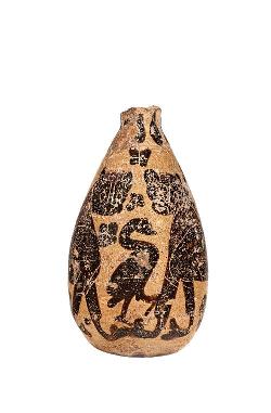 Alabastron piriforme corinzio con animale fantastico, sfinge.
