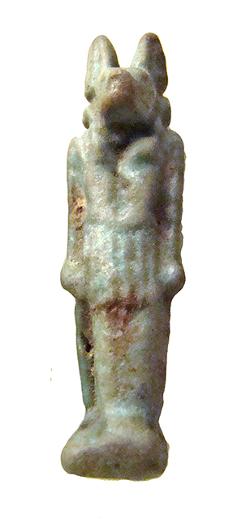 Amuleto in faience raffigurante Anubi con pilastro dorsale forato, dall'Egitto