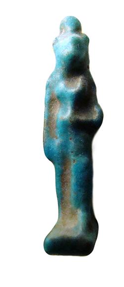 Amuleto in faience raffigurante Sekhmet con disco solare e uag, dall'Egitto