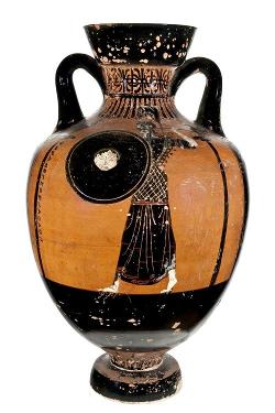 Anfora panatenaica apula a figure rosse. Lato A: giovane armato eroicizzato; Lato B: scena di offerta.