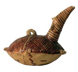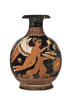 Askos attico a figure rosse. Lato A: sfinge. Lato B: cerva
