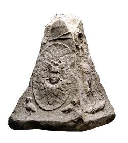 Coronamento a pulvino con testa di Gorgone e delfini in calcare da Trieste su inv. 13552