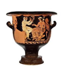 Cratere a campana campano a figure rosse Lato A: scena tetrale dionisiaca; Lato B: giovani ammantati