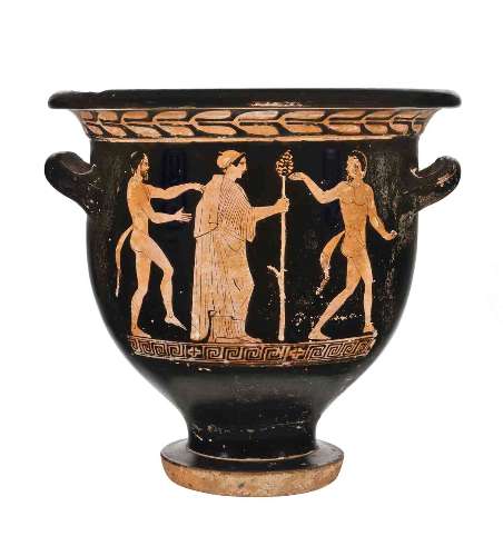 Cratere a campana campano a figure rosse Lato A:scena dionisica con menadi; Lato B: due giovani ammantati