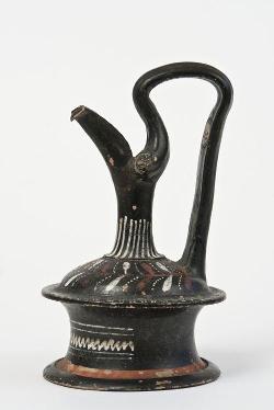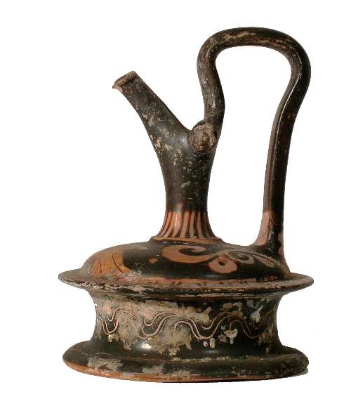 Epichysis apulo in terracotta a figure rosse da Rudiae. Lato A: testa femminile con stephanè