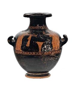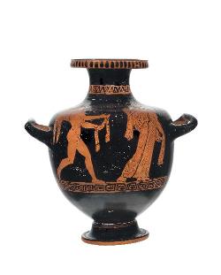 Hydria attica a figure rosse con eros nudo con stola e donna