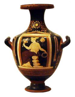 Hydria campana a figure rosse. Lato A: scena di offerta presso un monumento funerario