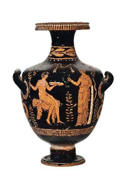 Hydria campana a figure rosse. Lato A: scena di offerta presso un monumento funerario