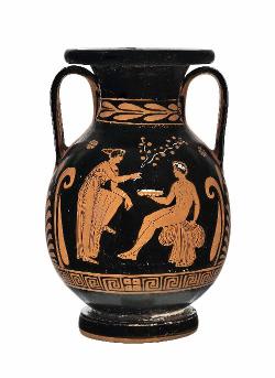 Pelike attica a figure rosse. Lato A: Eros, satiro e donna; Lato B: due giovani ammantati
