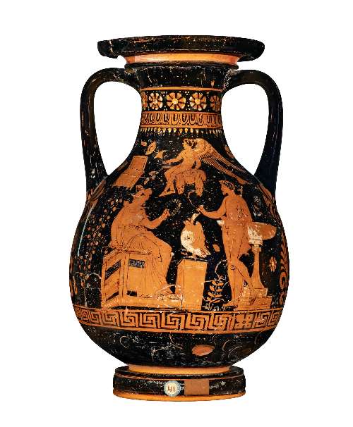 Pelike apula a figure rosse. Lato A: giovane e fanciulla>; Lato B: due giovani ammantati