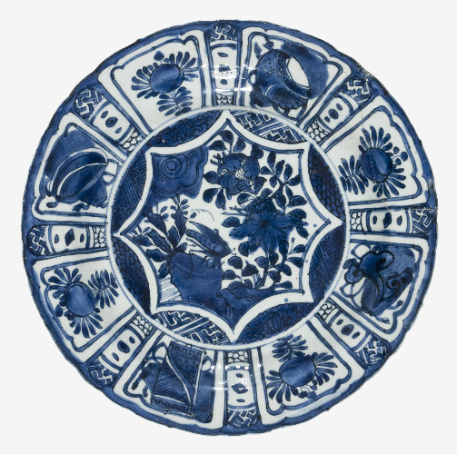 Piatto "bianco e blu" da esportazione, di tipo Kraak