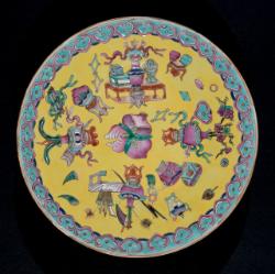 Piatto con oggetti delle "Cento Antichità" su fondo giallo