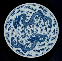 Piatto "bianco e blu" con due draghi a quattro artigli