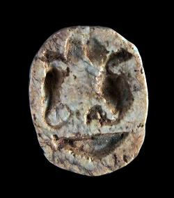 Scaraboide in steatite con due urei e corona, dall'Egitto