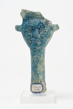 Manico di un sistro in faience con il volto della dea Hathor, dall'Egitto