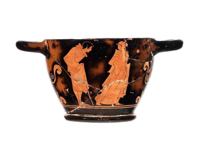 Skyphos attico a figure rosse. Lato A e B: uomo chino su un bastone e giovane donna ammantata