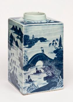 Vaso porta-tè "bianco e blu" con il "willow pattern"
